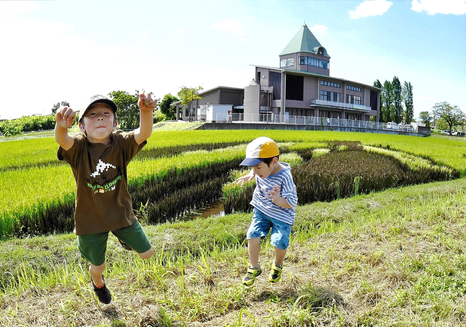コメント:元気いっぱいの2人の子供たちの写真です。一人は楽しそうにジャンプし、もう一人は田んぼの稲を見つめています。