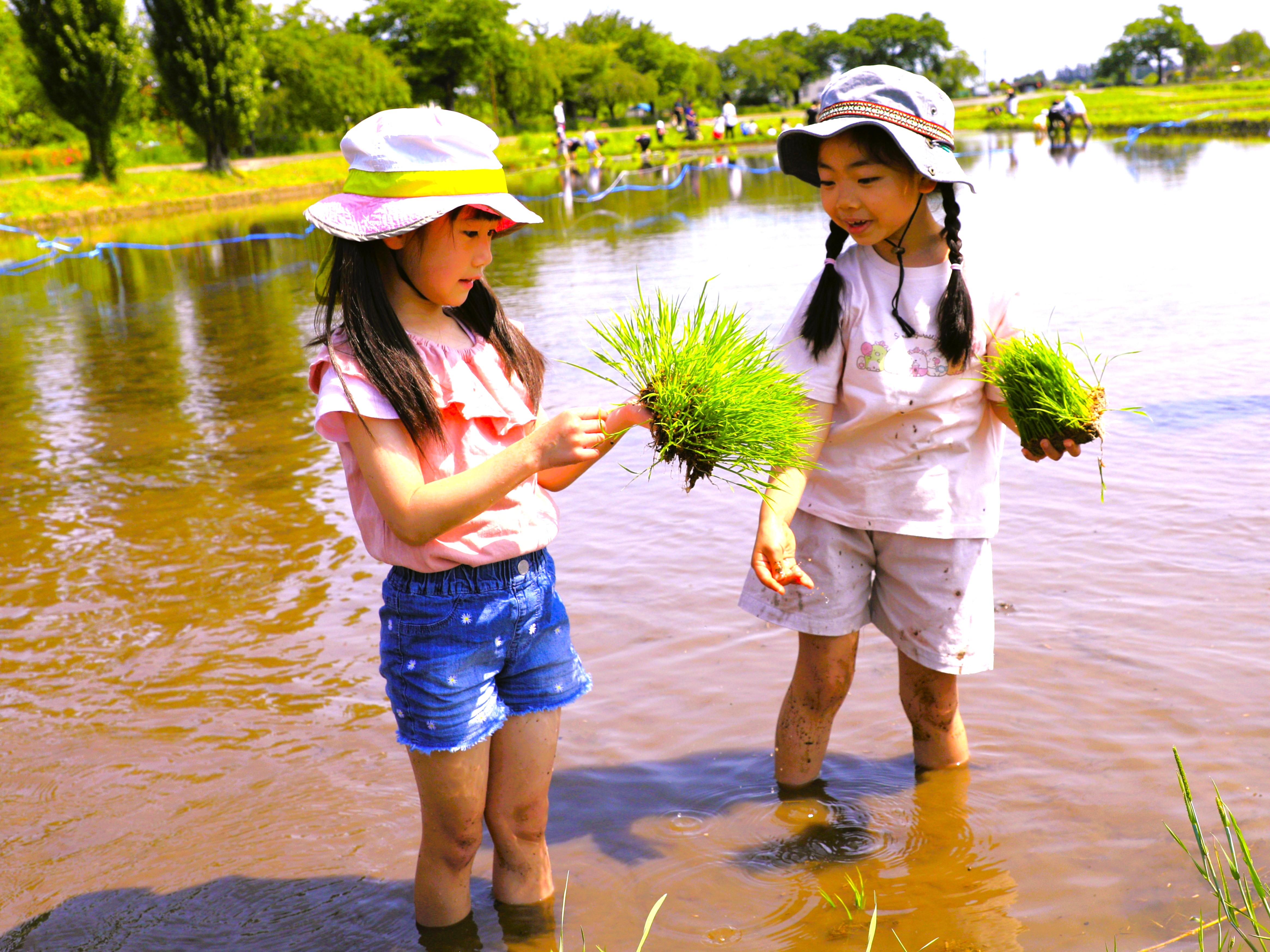 コメント:鏡石町の田んぼアートのお田植の日、女の子2人がとても楽しそうに田植えをしていました。