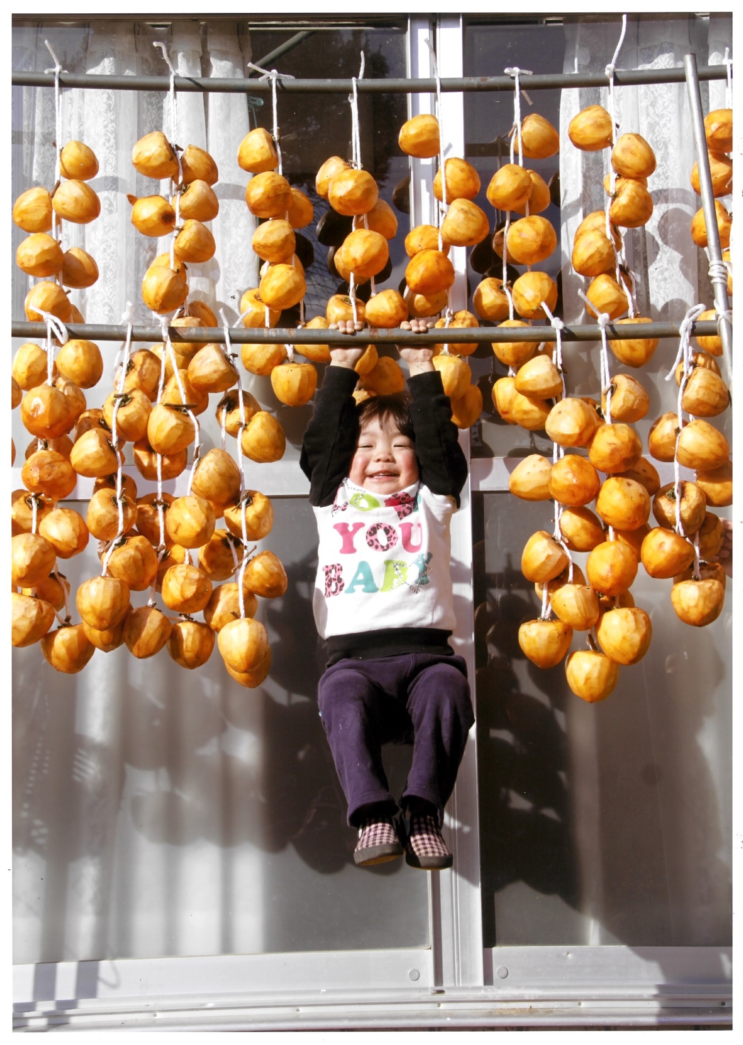 コメント:秋晴れの日、縁側で吊るし柿の作業時、孫が鉄棒にぶら下がって遊んで居たので、柿と一緒に撮って見ました。その孫も大きくなり、干し柿の季節になると思い出します。