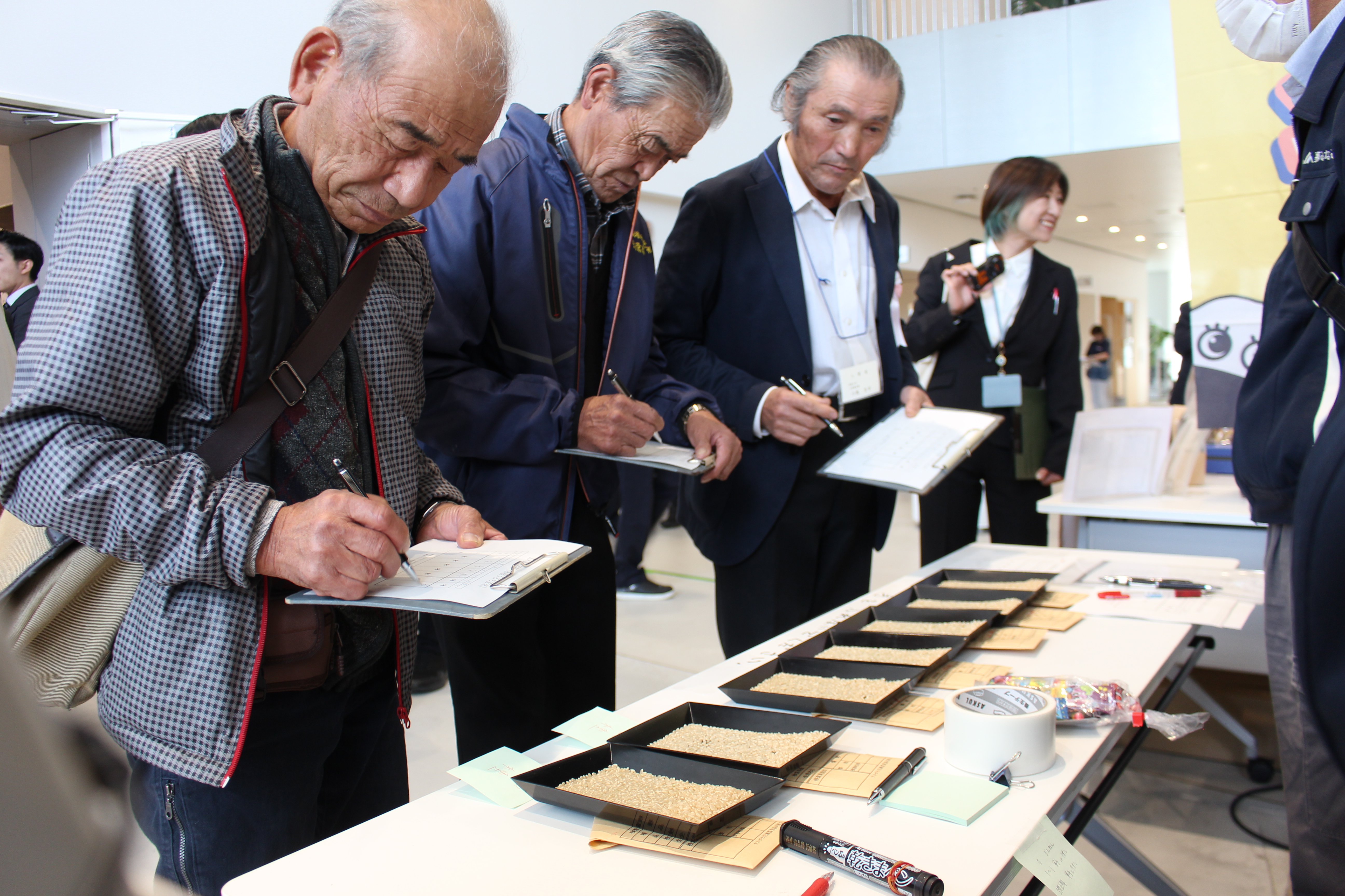 会場には農産品や特産品の販売コーナー、ノミネート米試食コーナーを設置。当JAのブースでは、「コシヒカリ」玄米の等級当てと品種鑑定のクイズを用意し、ひっきりなしに挑戦者が現れ、悩みながら答えを出していました。