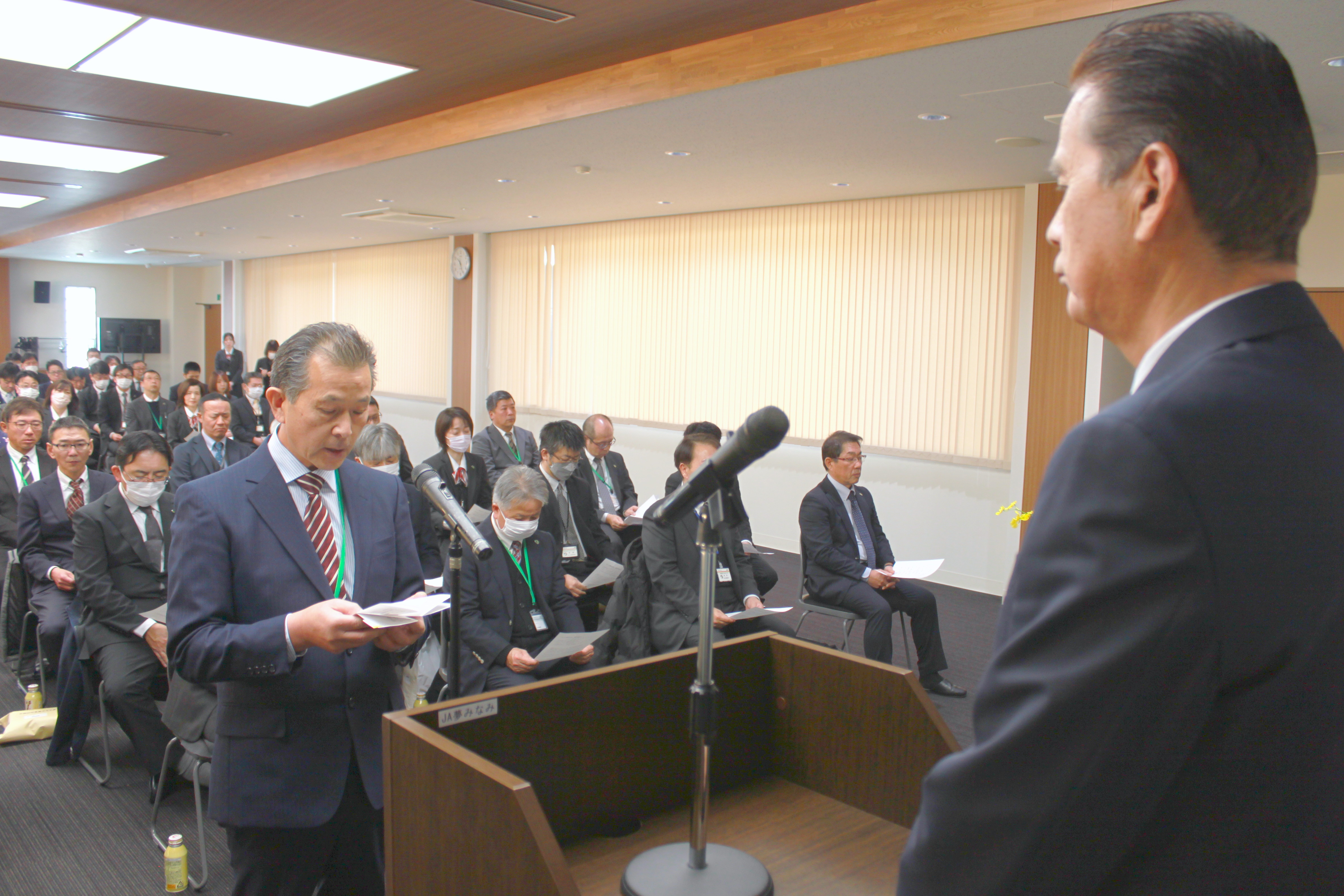 役職員約80人が出席した式では、丸山組合長が「持続可能な経営基盤確立のため組合員に信頼されるJAづくりを目指す」と挨拶。職員を代表して鈴木一美しらかわ地区統括部長が「事業目標達成に向け、誠心誠意取り組んでいく」と決意を表明しました。
