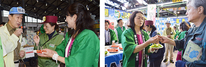 橋本組合長ら役職員と藤田良昭そさい部会長、女性部員、しらかわ地区管内の5市町村長(白河市、西郷村、泉崎村、中島村、矢吹町)、県南農林事務所、JA全農福島、白河市観光キャンペーンクルーなど40人が参加しました。大田市場では特設会場を設置し、早朝、競りに集まった市場関係者にしらかわ産野菜を試食してもらいました。