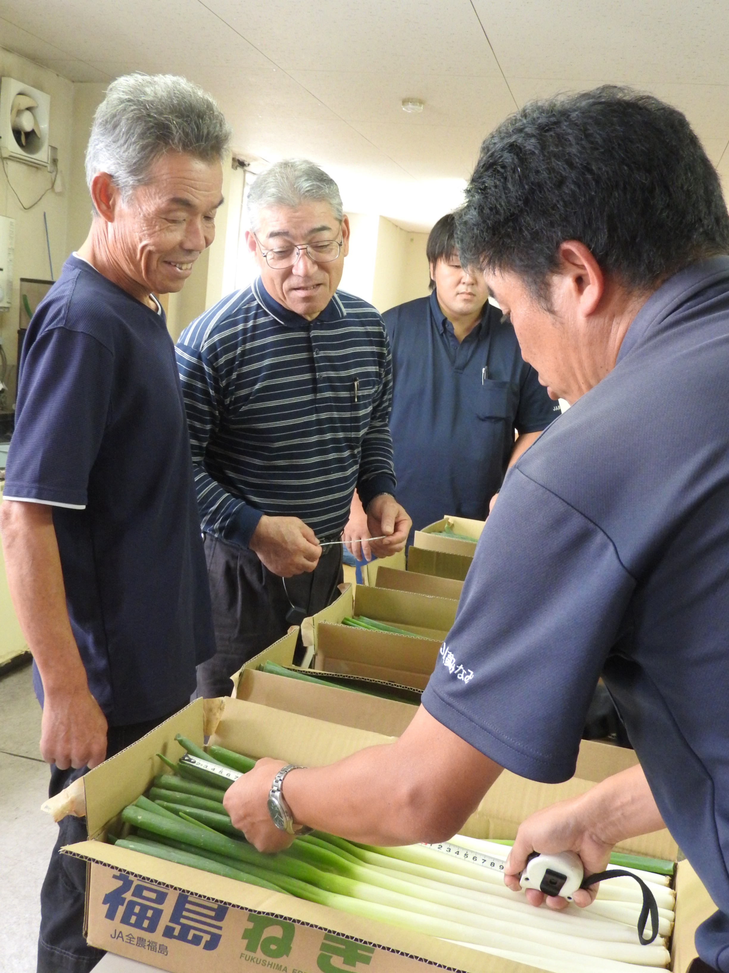 しらかわ地区は、9月4日、中島村のきゅうり選果場で令和元年度ネギ出荷目揃え会を行いました。生産者と担当者が出荷品と規格表を見比べながら、出荷規格の確認を行いました。