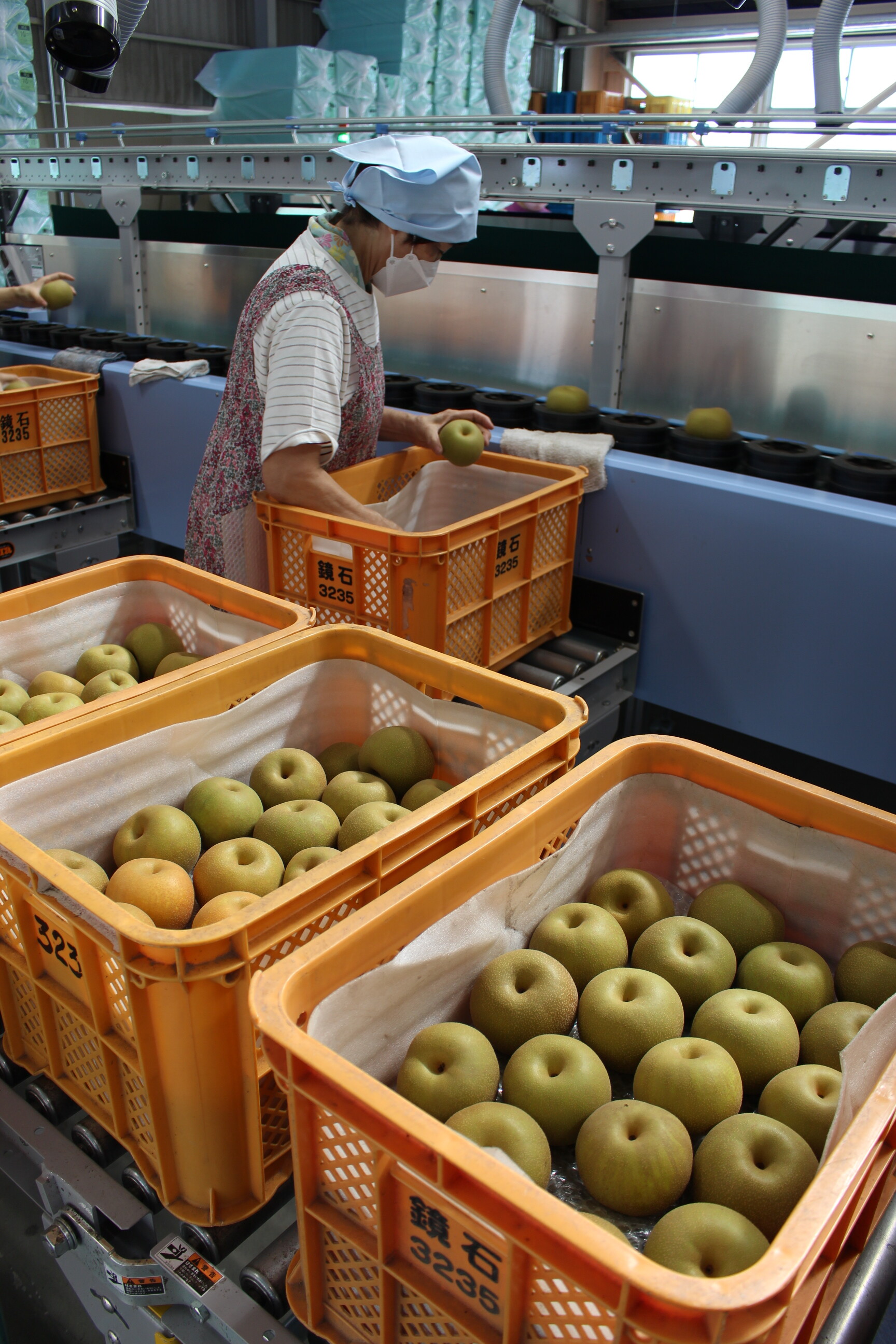 今年は6月上旬に発生した降ひょうの被害を受け品質面が心配されましたが、その後順調に生育し、例年通りの出荷開始となりました。病害虫の発生も抑えられ、大きさ、形状ともに良好。みずみずしく糖度も十分です。作業員30人が色づきやキズの具合など1つ1つ注意深くチェックし、高精度の光センサーで内部に品質に異常のある梨を取り除き高品質な梨を箱詰めしていきました。