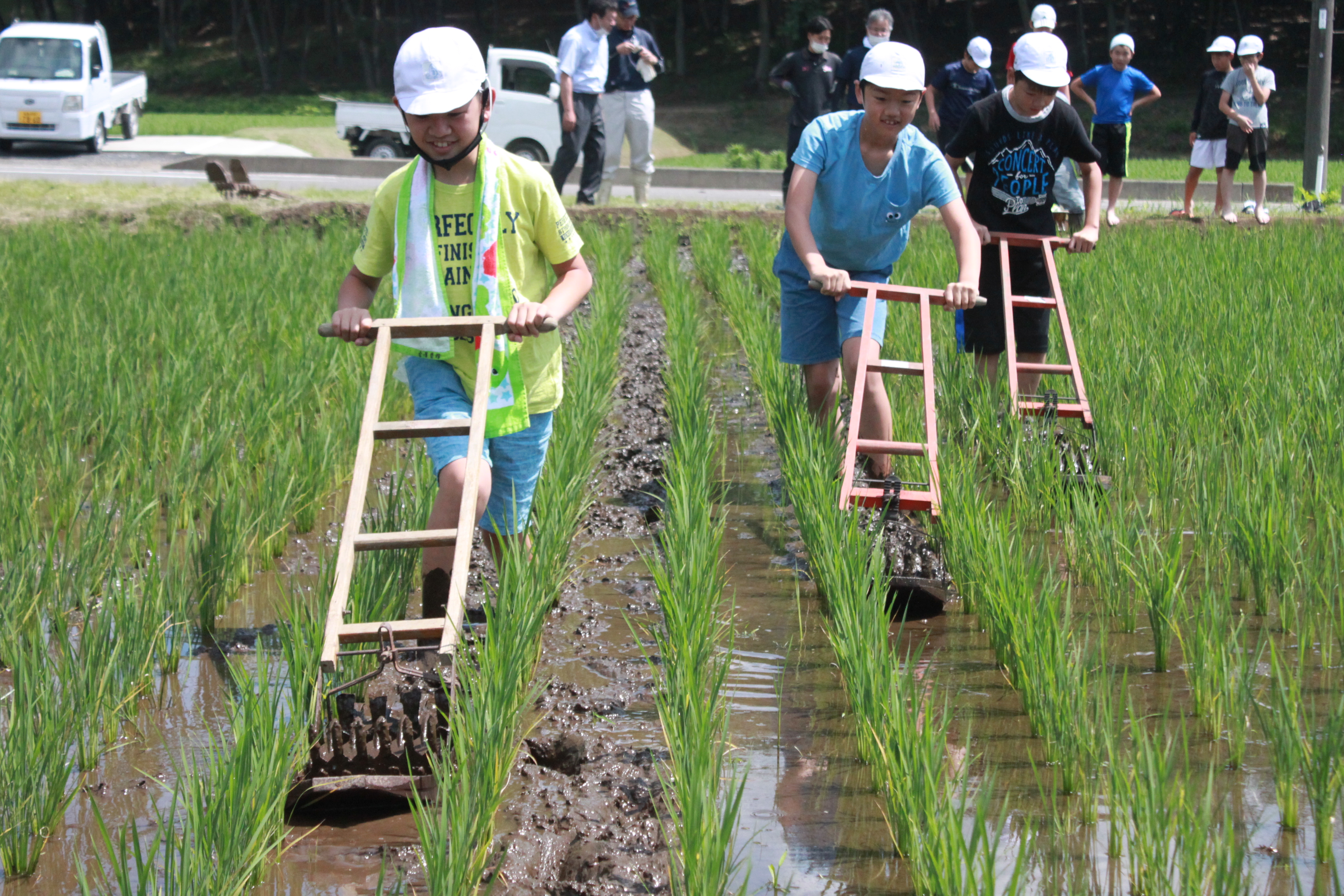 児童は高田さんらから除草作業の目的や歴史、水田中耕除草機の使い方を教わり、実際に体験。最初は慣れない作業に戸惑ったり田んぼに足を取られたりしつつも、教えてもらいながら徐々にコツをつかみ、5アールの田んぼを1時間かけて除草しました。