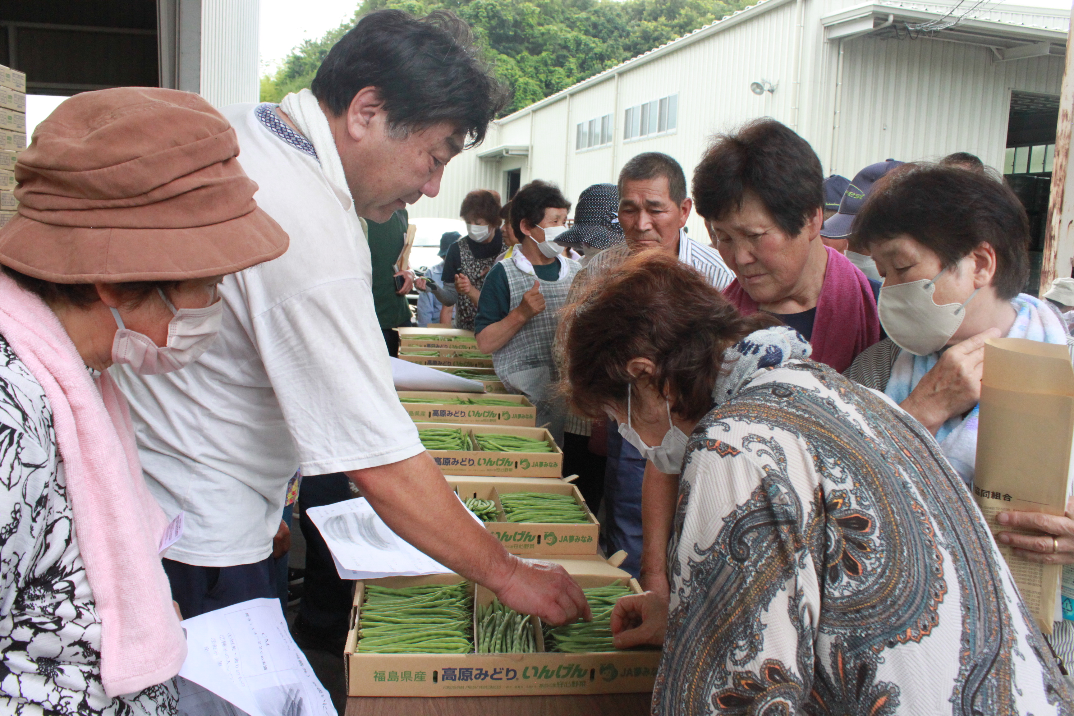 7月11日、平田サブ営農センターでサヤインゲン「高原みどり」の出荷指導会を開きました。平田・古殿・玉川支店管内の生産者53人とJA職員が参加。収穫開始期から最盛期までの栽培指導をし、目揃えをしました。